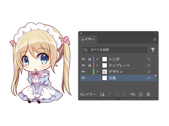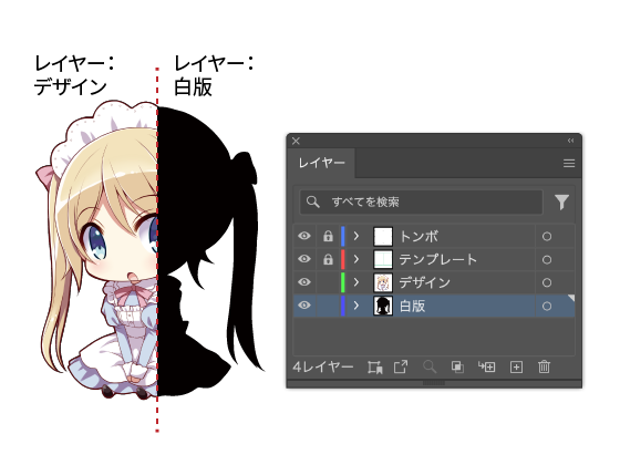デザインの入ったレイヤー(下記画像内「4色版」)の透けてほしくない部分をコピーし白版レイヤーに、メニューの「編集」→「同じ位置にペースト」で貼り付けます。