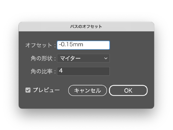白版データ選択します。 メニューの「効果」→「パス」→「パスのオフセット」でパスのオフセットウィンドウを呼び出し。 オフセットを「-0.15mm」に設定します。